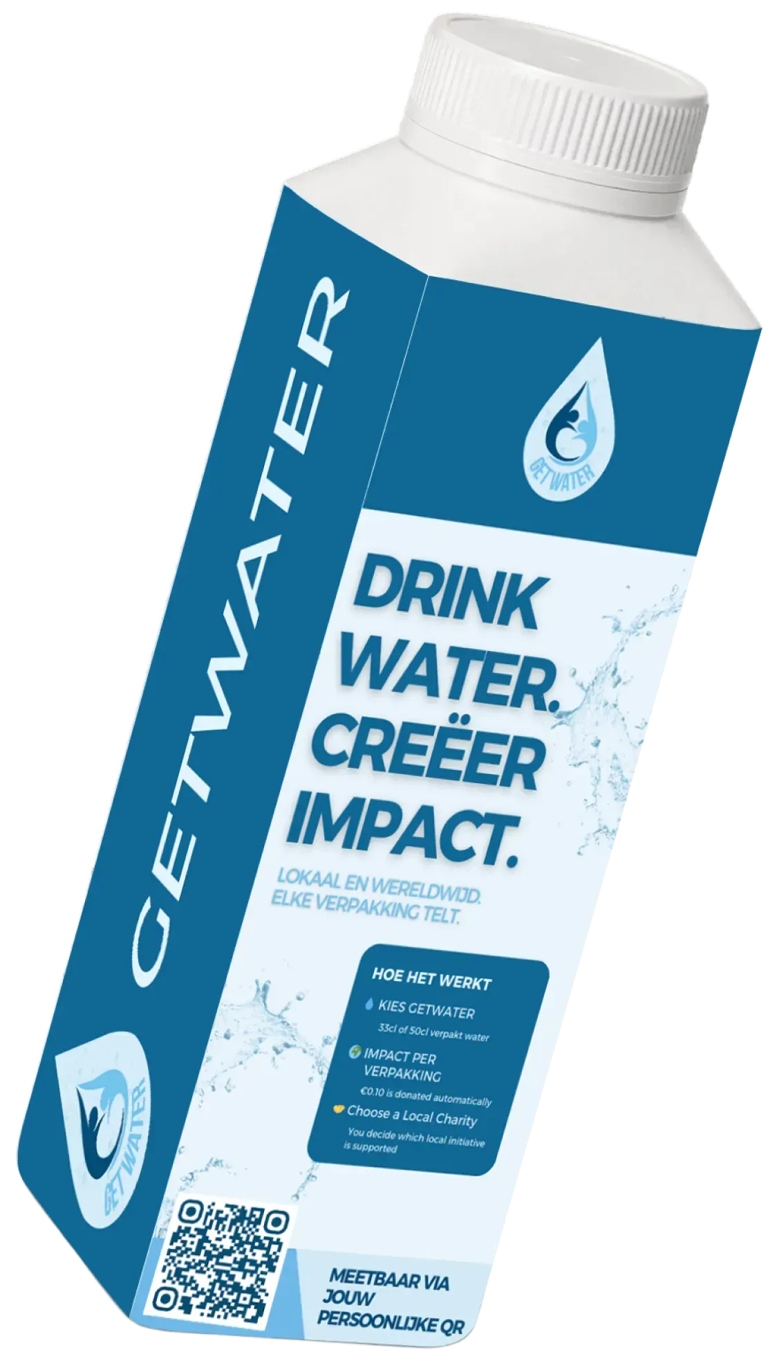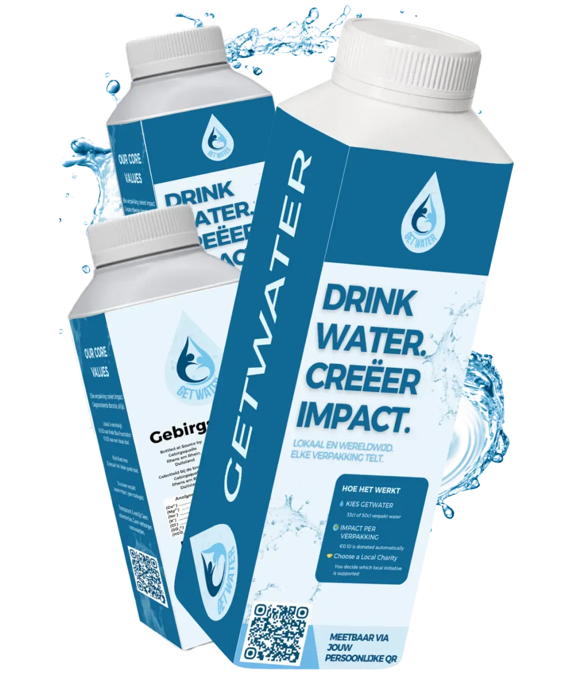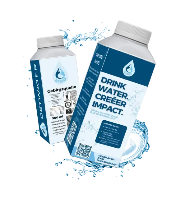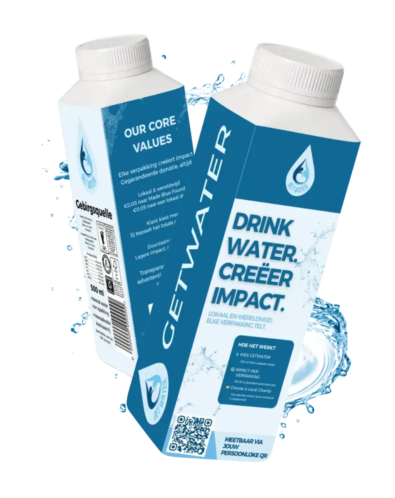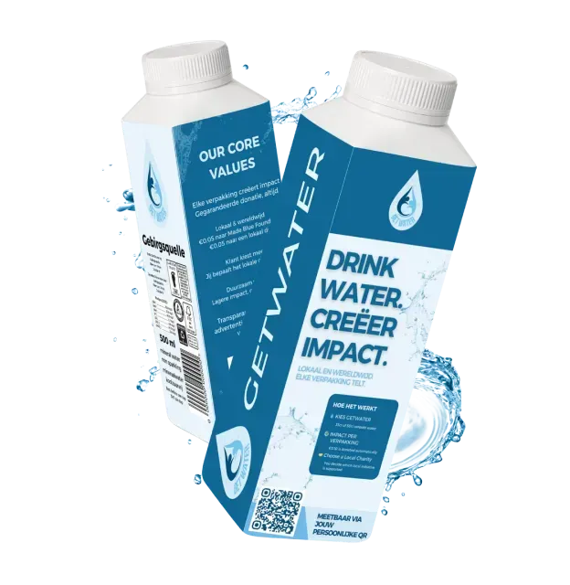 GetWater is een commercieel watermerk dat drinkwater aanbiedt in duurzaam verpakte flessen. Elke verkocht verpakking creëert meetbare sociale impact door lokale en wereldwijde schoonwaterinitiatieven te ondersteunen.